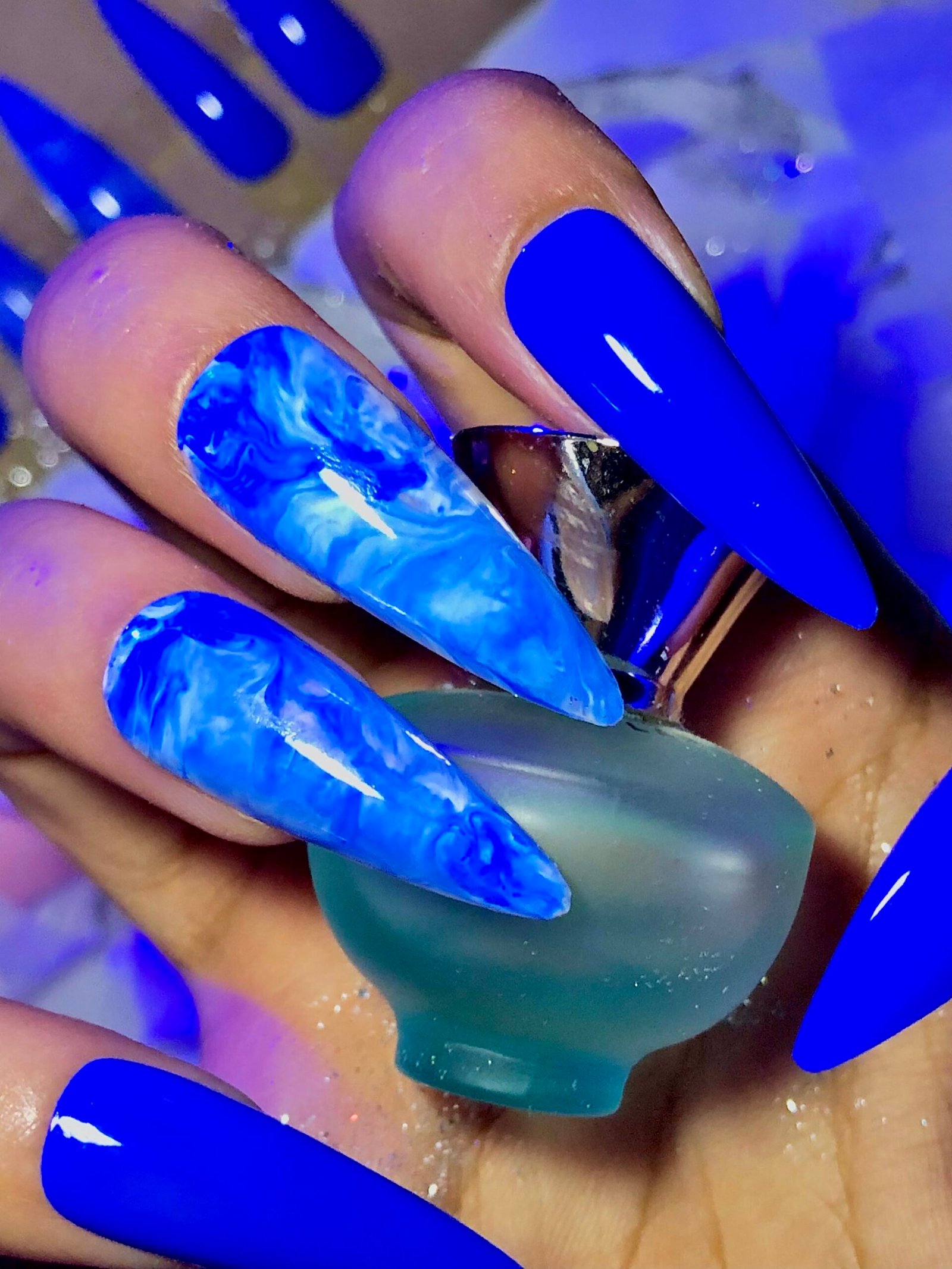 A beautiful shade of blue with marbles accent nails!