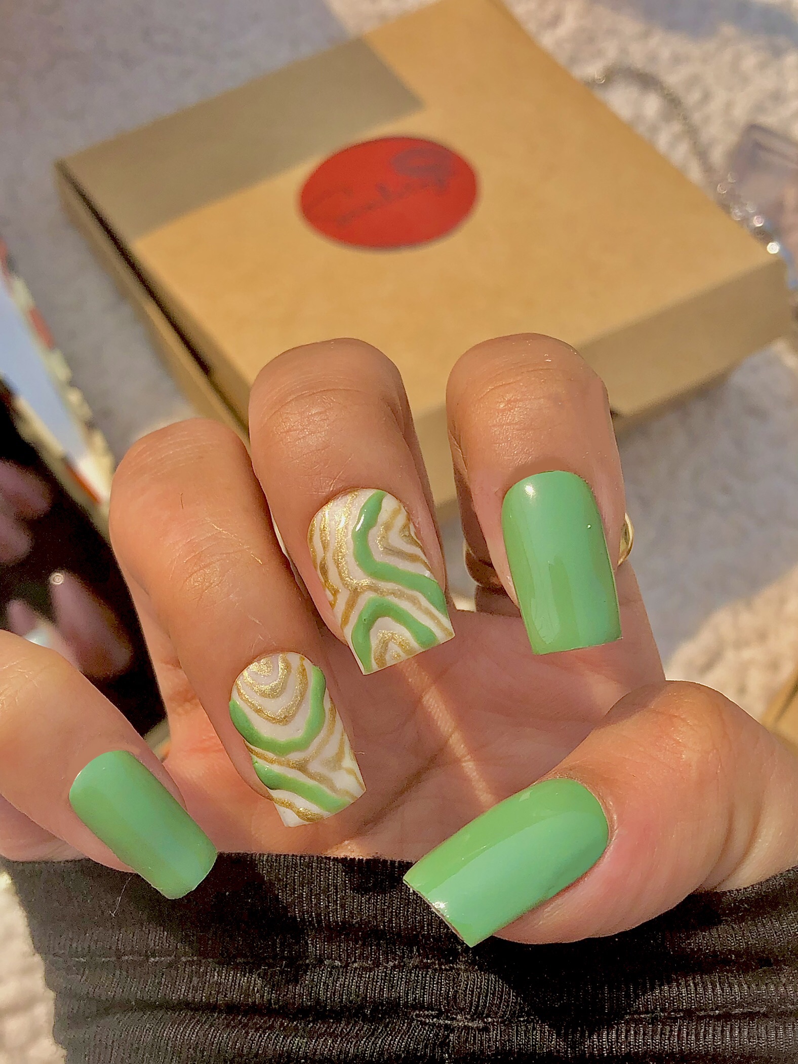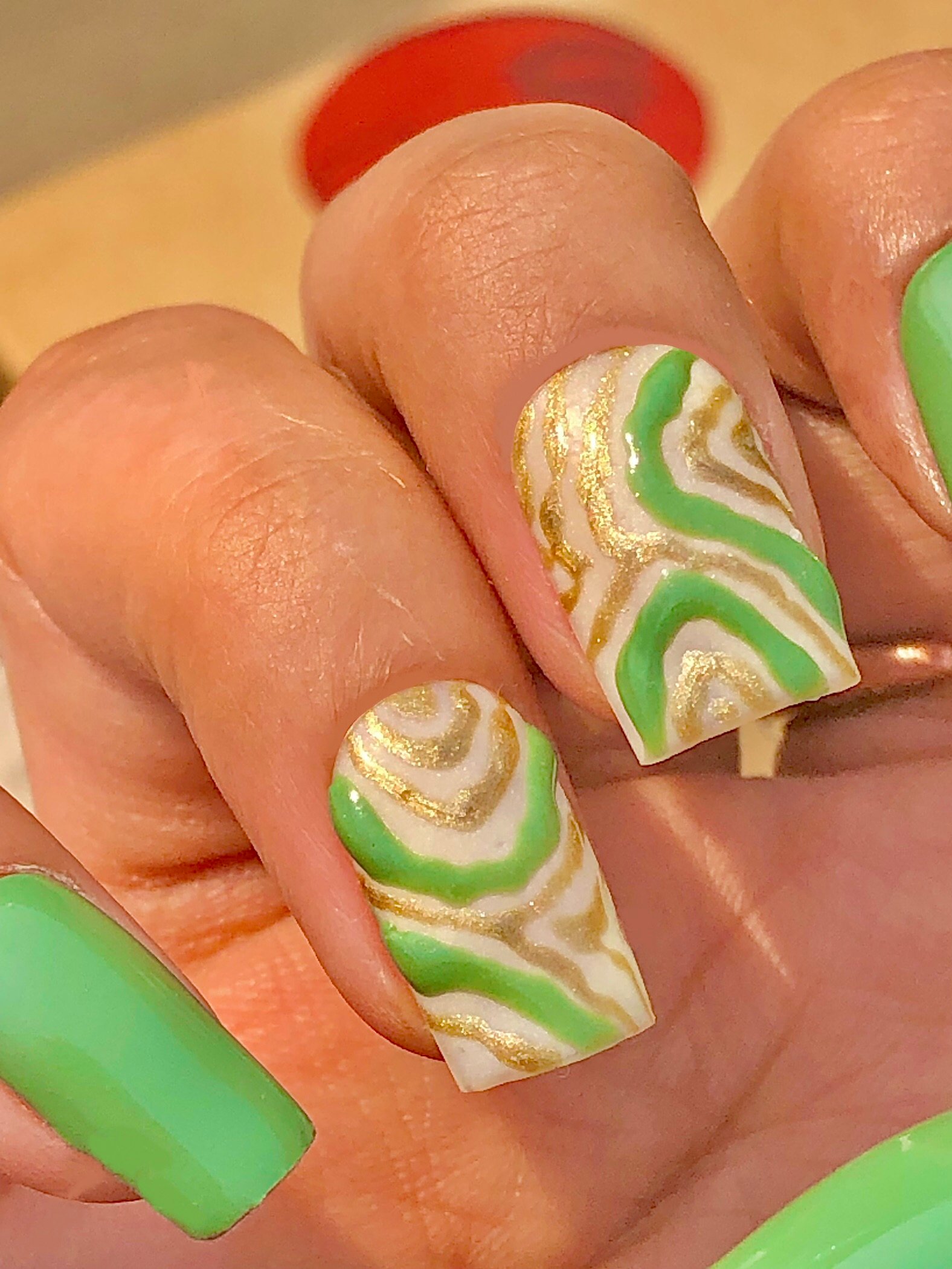 Green nails with golden detailing; a true match for trouble makers.