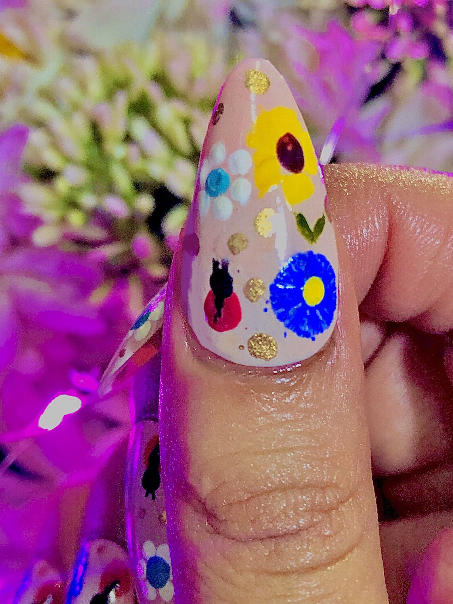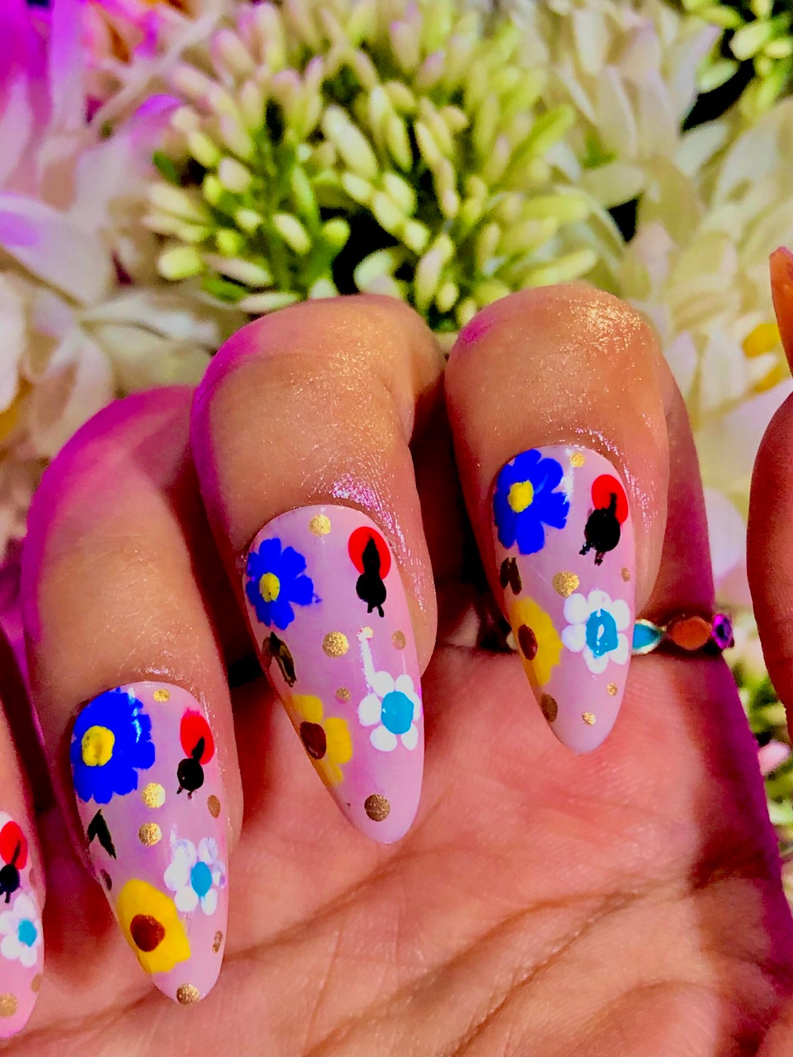 Lady bud and flowers on nude base that would bring the court of spring to shame.