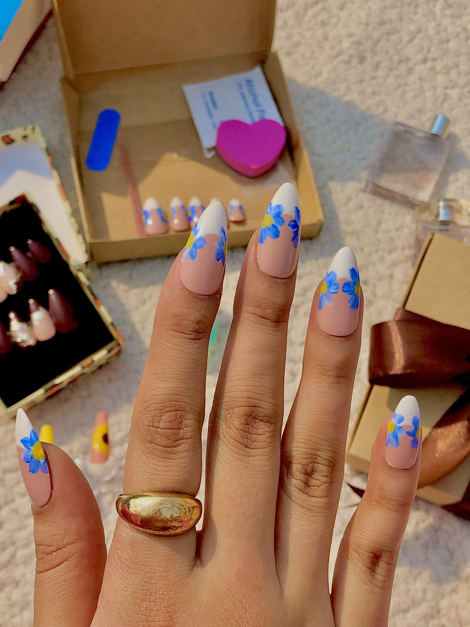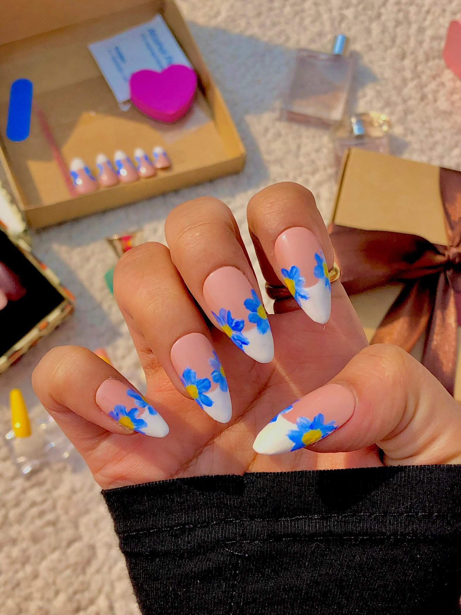 White french tips with cobalt blue flowers on either side because we love blue like no one else.