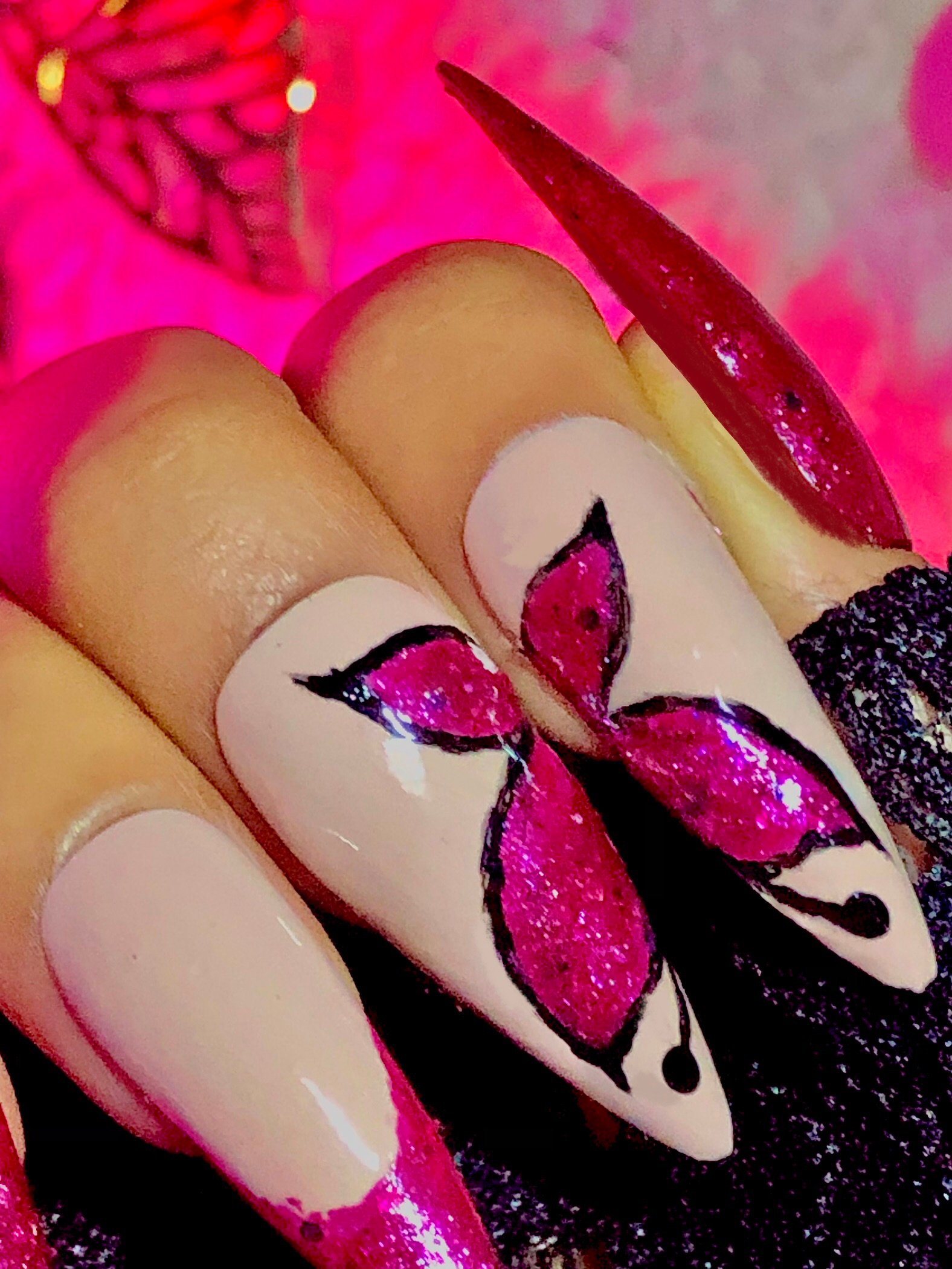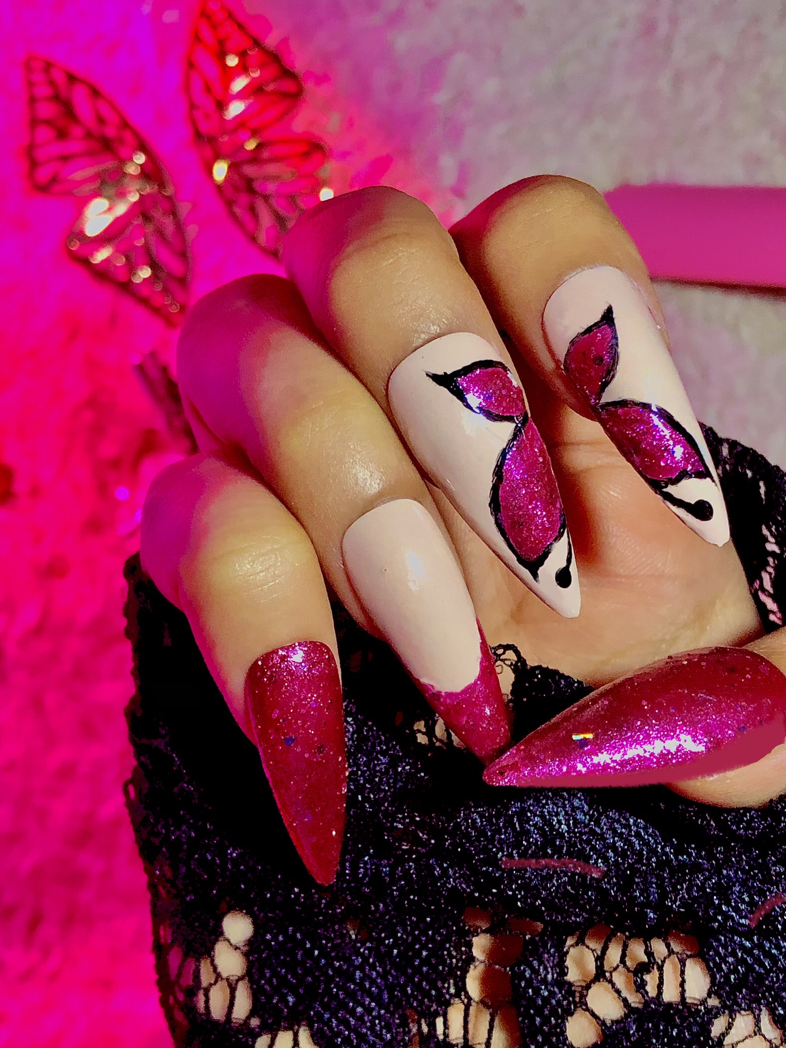 Who wouldn’t want a glittery pink butterfly with glittery pink french tips?